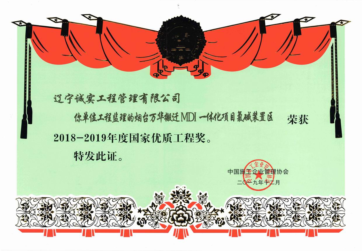 2018-2019年度國家優(yōu)質(zhì)工程獎(煙臺萬華搬遷MDI一體化項目氯堿裝置區(qū))