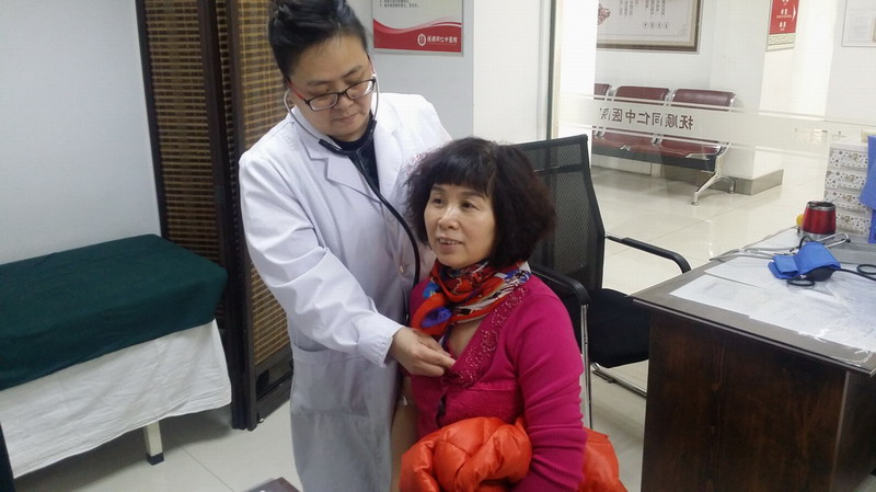 醫(yī)生拿著聽(tīng)診器在為員工做內(nèi)科檢查