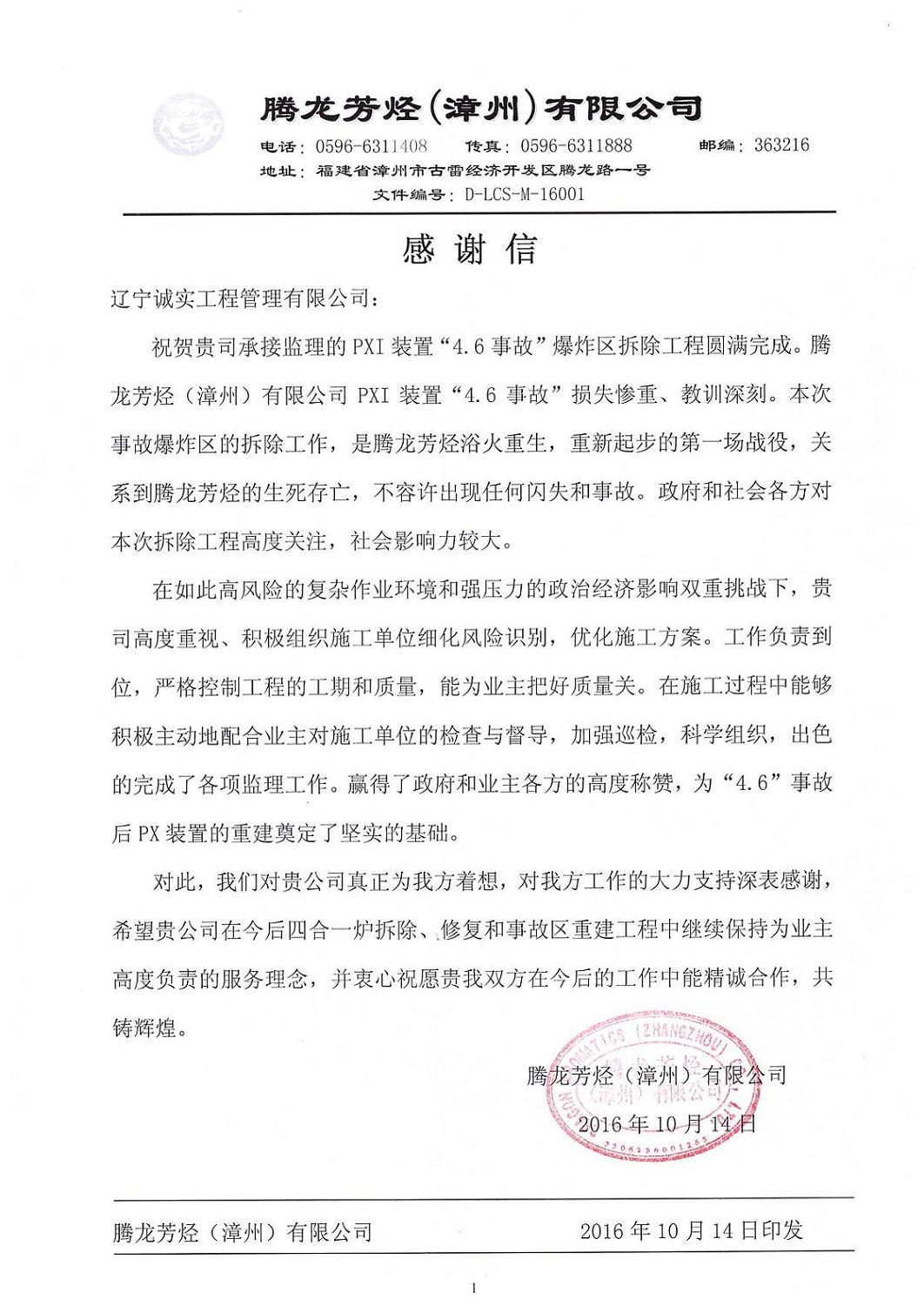 我公司監(jiān)理人員在“騰龍芳烴(漳州)有限公司PXI裝置4.6事故爆炸區(qū)拆除”工程監(jiān)理服務(wù)工作中,得到了業(yè)主單位的認(rèn)可和肯定,對我們的工作表示十分滿意,特發(fā)感謝信提出表揚。