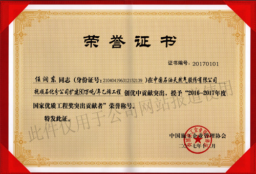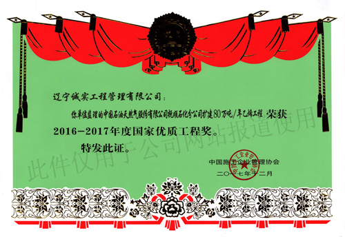 2017年11月10日,根據(jù)中施企協(xié)字【2017】66號(hào)文件——《關(guān)于表彰2016-2017年度國(guó)家優(yōu)質(zhì)工程獎(jiǎng)的決定》公告,我單位所監(jiān)理的“中國(guó)石油天然氣股份有限公司撫順石化分公司擴(kuò)建80萬(wàn)噸/年乙烯工程”榮獲2016-2017年度國(guó)家優(yōu)質(zhì)工程獎(jiǎng),該項(xiàng)目總監(jiān)“任潤(rùn)東”還獲得了“2016-2017年度第二批國(guó)家優(yōu)質(zhì)工程獎(jiǎng)突出貢獻(xiàn)者”的榮譽(yù)稱號(hào)。