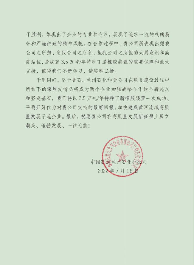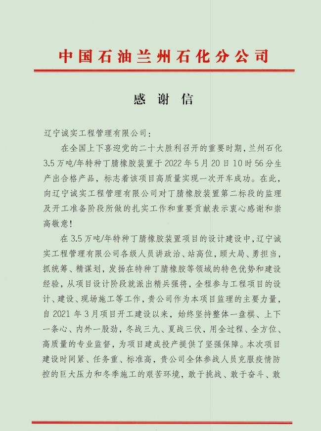 近日,由我公司監(jiān)理的中國(guó)石油天然氣股份有限公司蘭州石化分公司--3.5萬砘/年特種丁腈橡膠項(xiàng)目喜獲業(yè)主表揚(yáng)信。表揚(yáng)信充分肯定了誠(chéng)實(shí)監(jiān)理的工作成果,對(duì)駐蘭州項(xiàng)目部全體監(jiān)理工程師在項(xiàng)目建設(shè)過程中所付出的努力表示由衷的感謝。