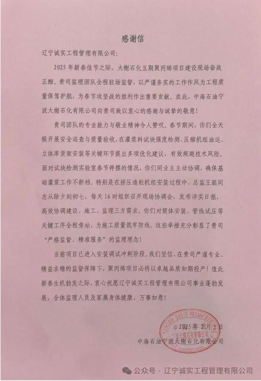 2025年2月5日,當許多人仍沉浸在新春佳節(jié)的喜悅之中時,中海油大榭石化五期聚丙烯項目監(jiān)理部以專業(yè)、奉獻的精神為項目安裝調(diào)試沖刺的關鍵過程保駕護航,并收獲到來自中海石油寧波大榭石化有限公司發(fā)來的一封感謝信。