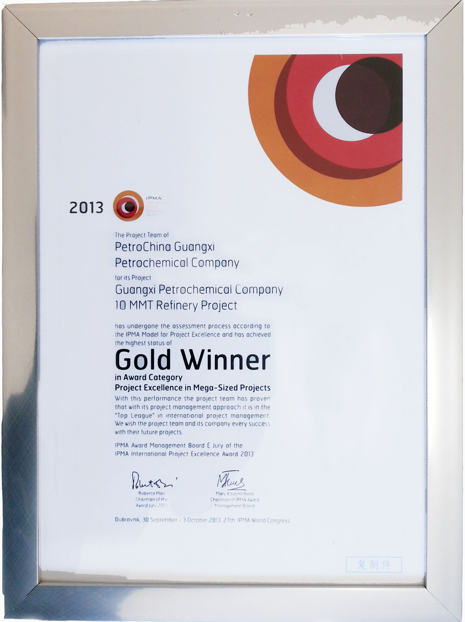 10月2日,從克羅地亞杜布羅夫尼克傳來一個令人振奮的消息,在當(dāng)?shù)嘏e行的第27屆IPMA國際項目管理大會上,我公司監(jiān)理的廣西石化千萬噸煉油項目以最高得分,從澳大利亞海水淡化項目、印度HPCL—MITTAL能源公司GGS煉油項目等14個入圍項目中脫穎而出,榮獲了IPMA國際卓越項目管理最高獎項—特大型項目金獎。這是繼神舟六號載人飛船項目(2006,第20屆)、中海油惠州煉油項目(2010,第24屆)之后,中國第3個獲此殊榮的特大型項目。