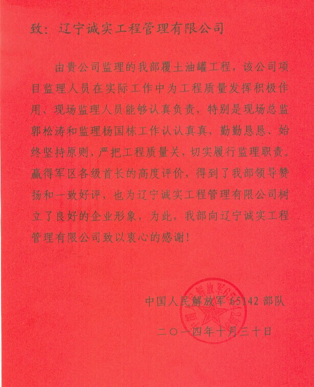 信中,中國人民解放軍65142部隊對我公司及項目監(jiān)理人員表示衷心的感謝。我公司項目監(jiān)理人員能夠認(rèn)真負(fù)責(zé)地工作,切實履行監(jiān)理職責(zé),并且對該項目的總監(jiān)理工程師郭松濤同志與工程師楊國棟同志提出了表揚。為此軍區(qū)各級首長給予了高度評價,得到了65142部隊領(lǐng)導(dǎo)的贊揚和一致好評!